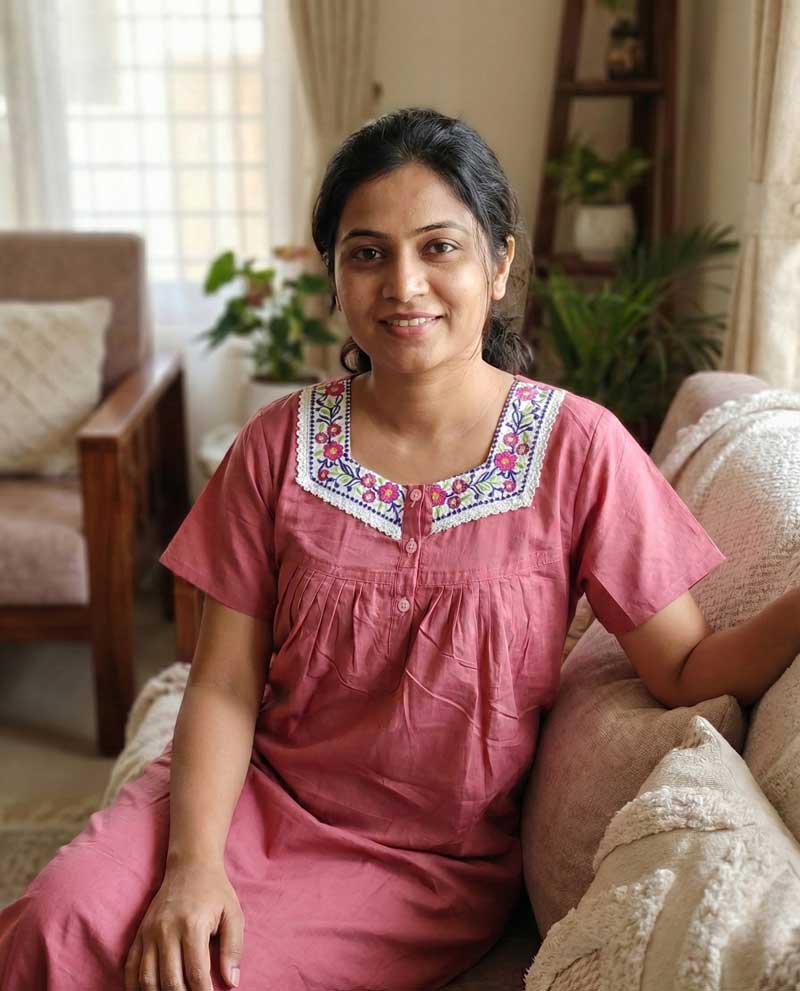 This nighty can be hand washed or a normal machine washed with cold water. Please make sure to dry the nighty in a light shade away from direct sunlight.