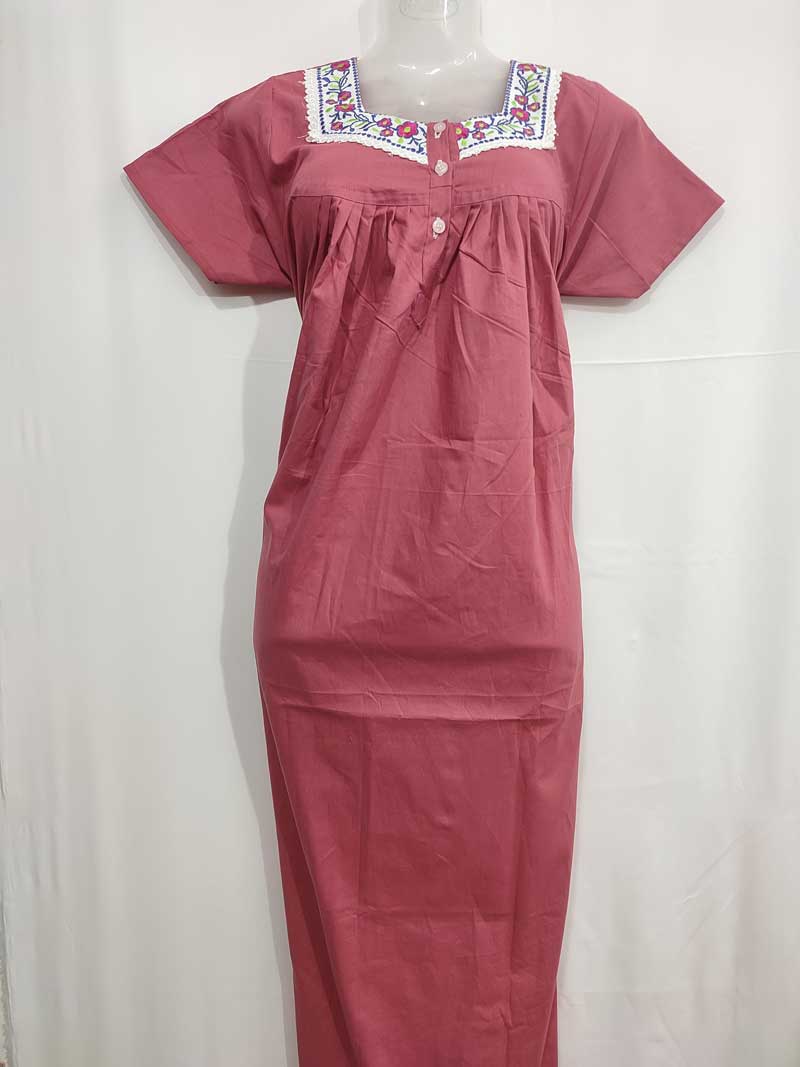 Front Open Cotton Nighty With Embroidary Neck, 55 Inches Long – Onion Pink