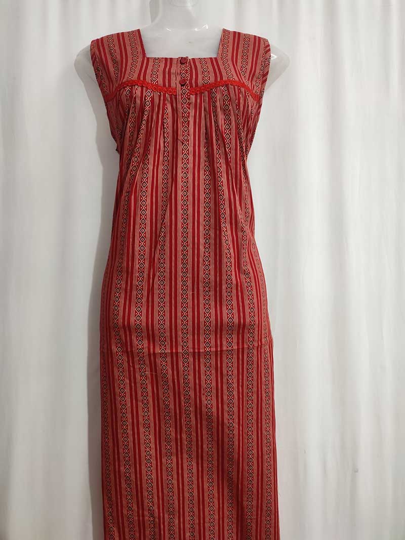 Front Open Cotton Sleeveless Nighty With Buttons, 55 Inches Long – Red