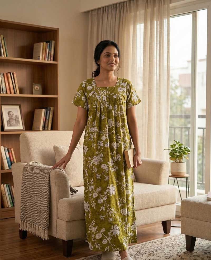 This nighty can be hand washed or a normal machine washed with cold water. Please make sure to dry the nighty in a light shade away from direct sunlight.