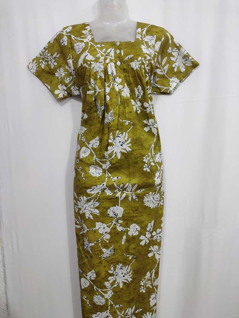 Front Open Cotton Nighty With Buttons, 55 Inches Long – Green Yellow