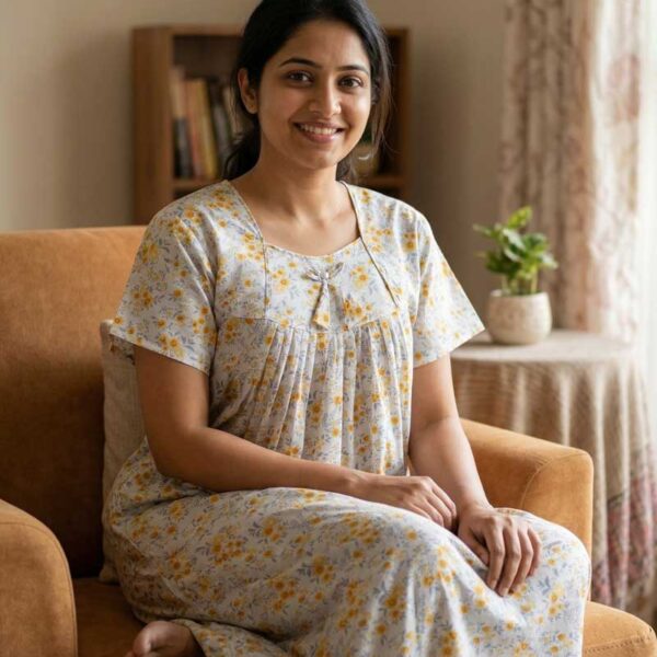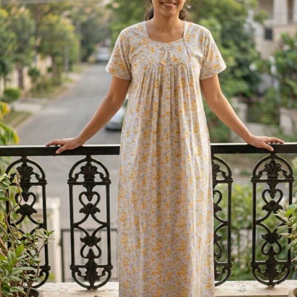 Traditional Cotton Frock Nighty, 55 Inches Length – White + Yellow Flowers