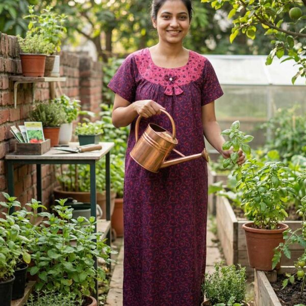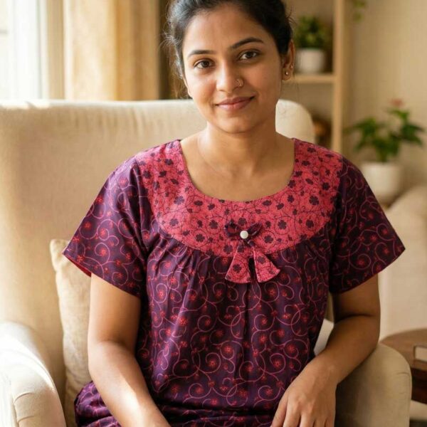 Traditional Cotton Nighty, 55 Inches Length, Round Neck – Grape Vine
