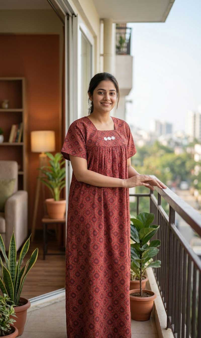 This nighty can be hand washed or a normal machine washed with cold water. Please make sure to dry the nighty in a light shade away from direct sunlight.