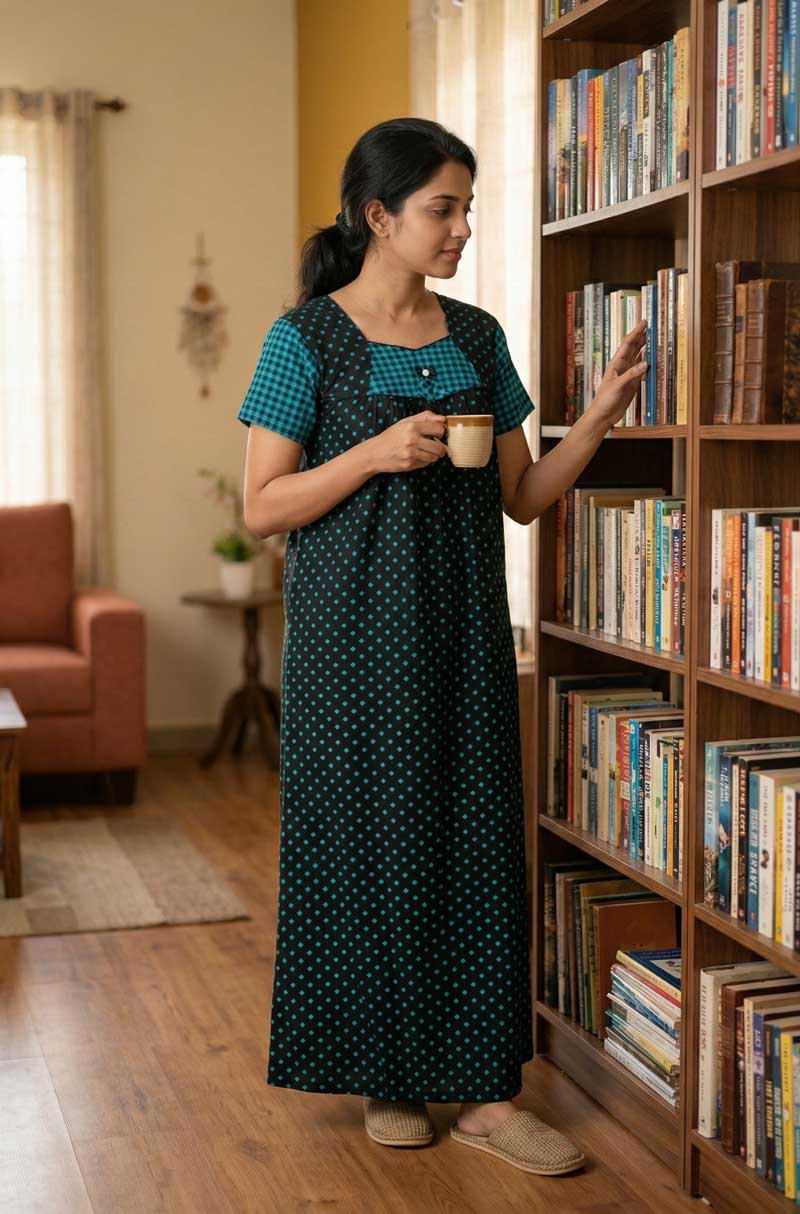 Comfortable Cotton Nighty With Buttons, 57 Inches Long – Pistha Green