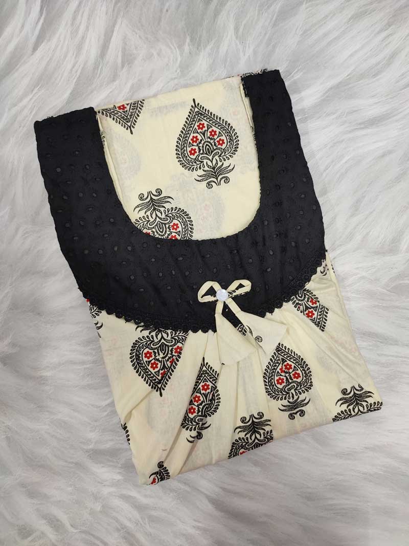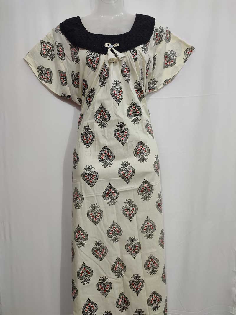 Traditional Cotton Nighty, 55 Inches Length, Hacoba Round Neck – Cream Colour