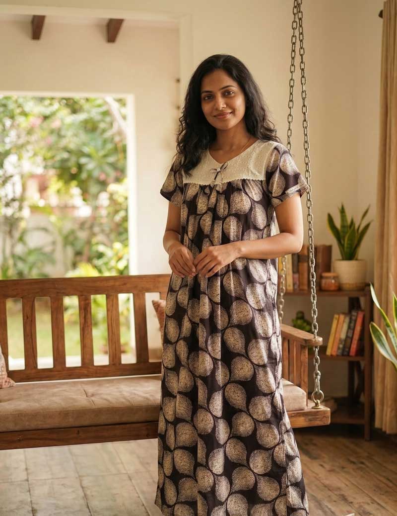 Traditional Cotton Nighty, 55 Inches Length, Hacoba Yoke – Brown