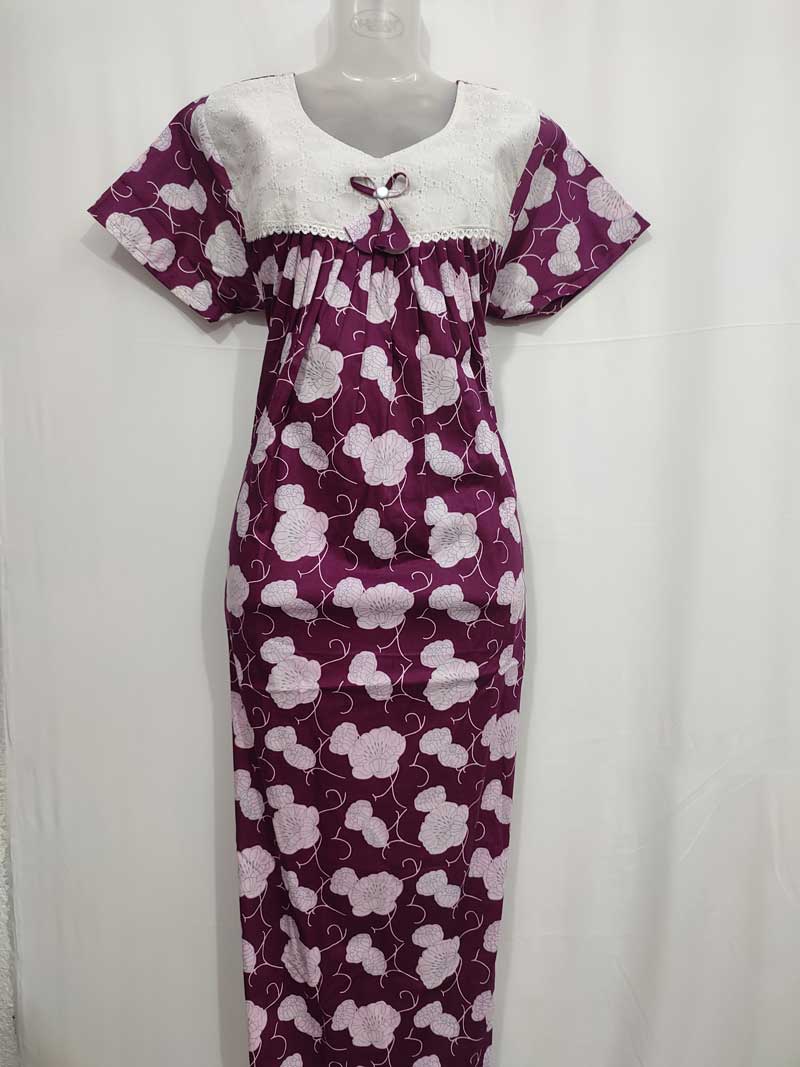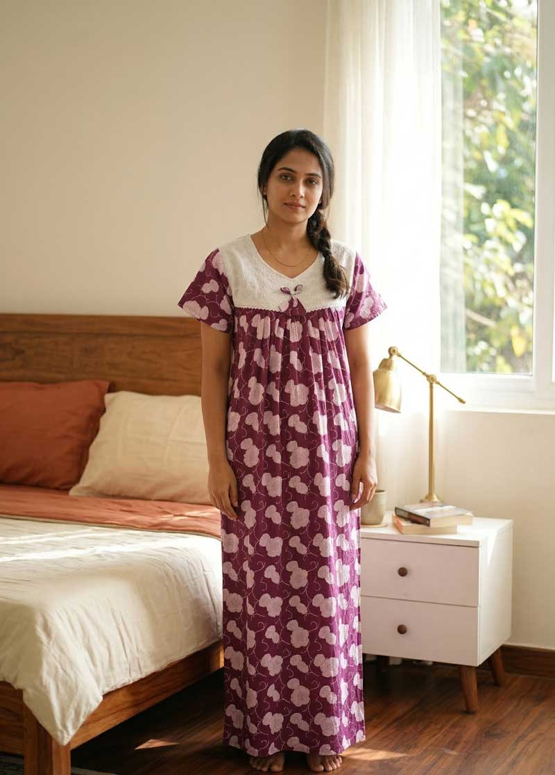Traditional Cotton Nighty, 55 Inches Length, Hacoba Yoke – Violet