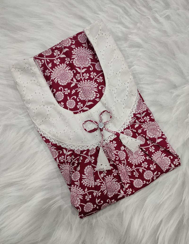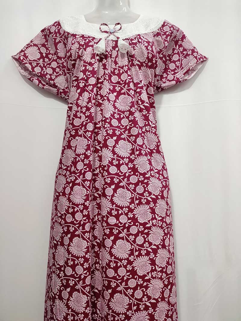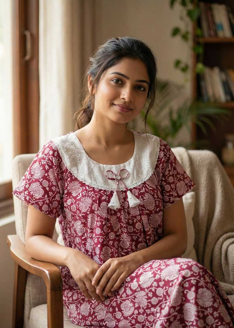 Traditional Cotton Nighty, 55 Inches Length, Round Hakoba Yoke – Red