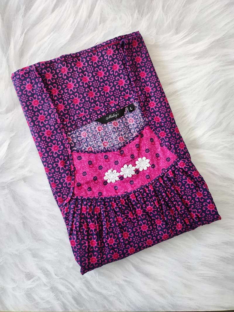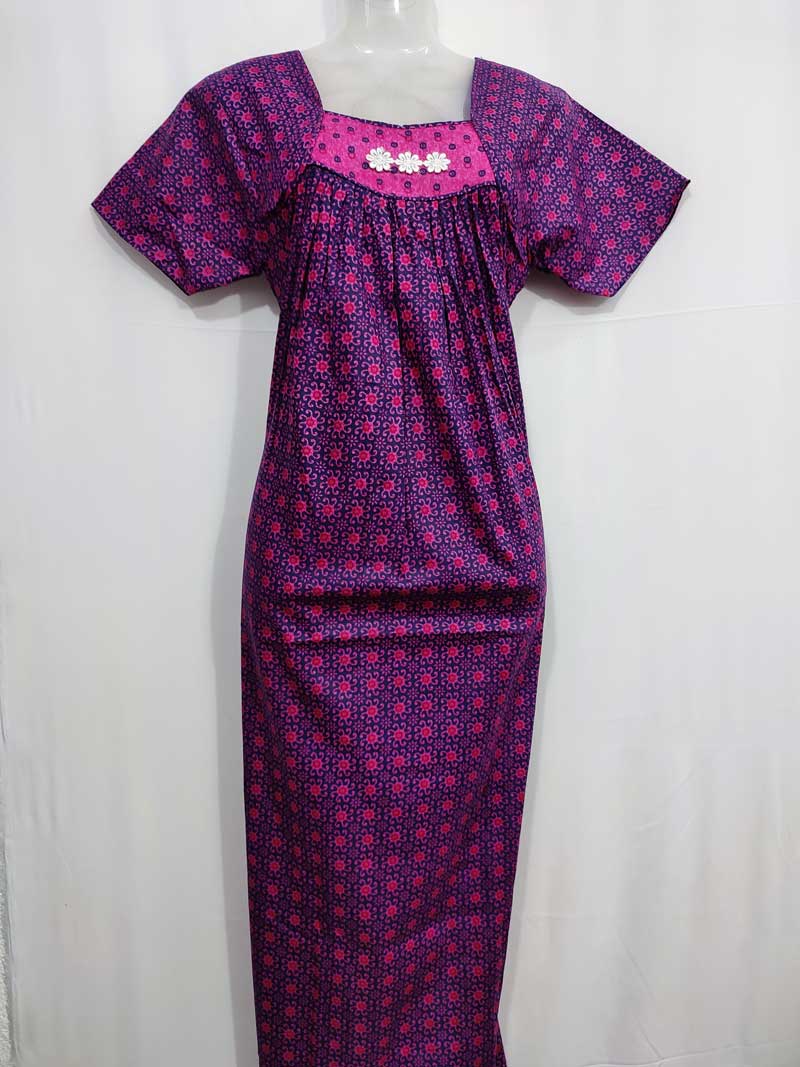 Traditional Cotton Nighty, 55 Inches Length – Dark Blue + Rose