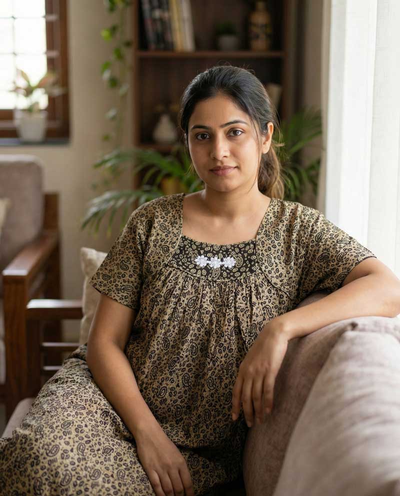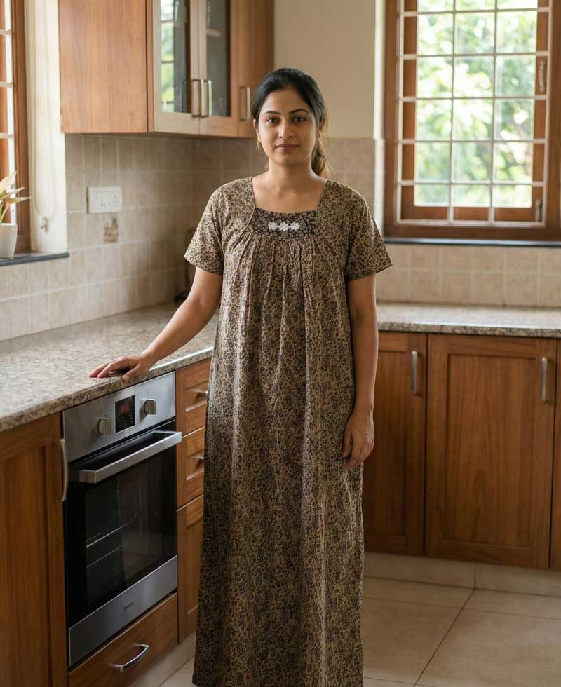 This nighty can be hand washed or a normal machine washed with cold water. Please make sure to dry the nighty in a light shade away from direct sunlight.