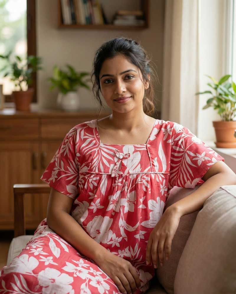 This nighty can be hand washed or a normal machine washed with cold water. Please make sure to dry the nighty in a light shade away from direct sunlight.