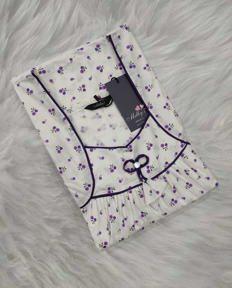 Traditional Cotton Nighty, 55 Inches Length – White + Violet