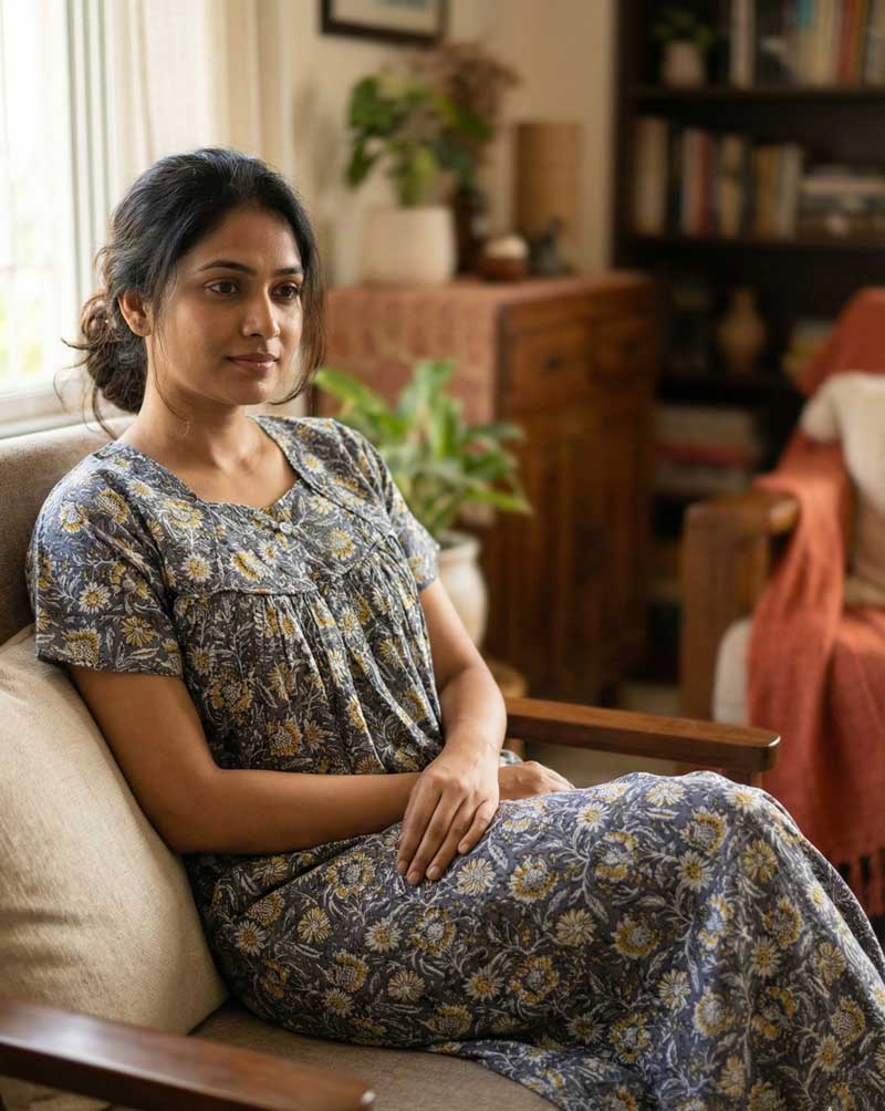 This nighty can be hand washed or a normal machine washed with cold water. Please make sure to dry the nighty in a light shade away from direct sunlight.