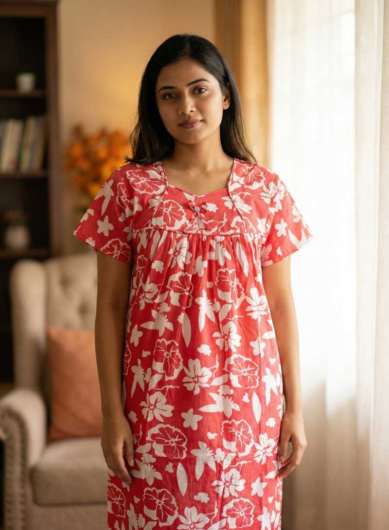 This nighty can be hand washed or a normal machine washed with cold water. Please make sure to dry the nighty in a light shade away from direct sunlight.