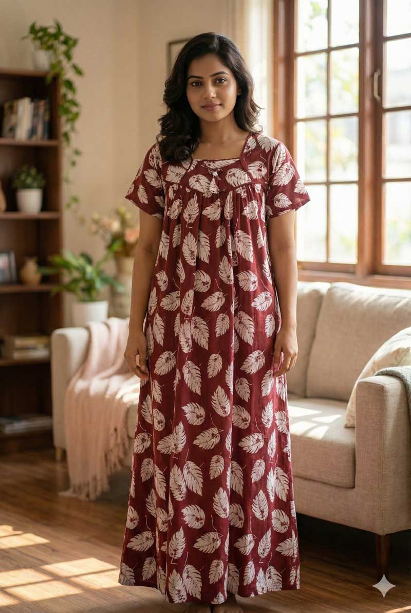 Traditional cotton nighty, Thali detailing on neck, 55 Inches Length – Maroon colour