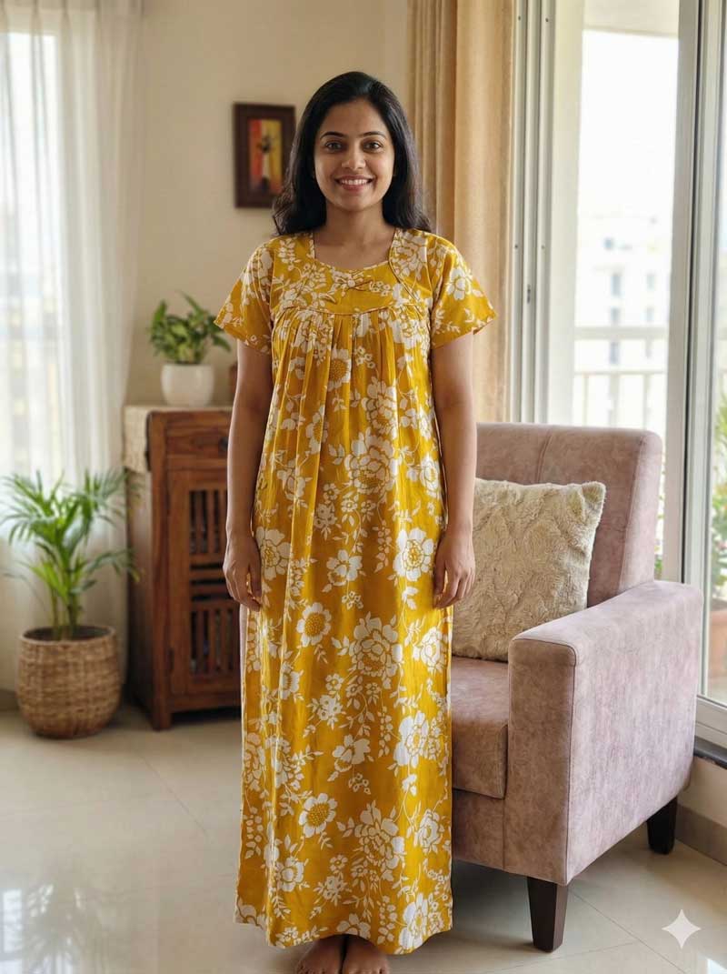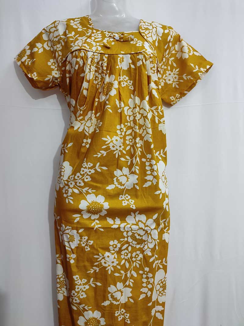 Traditional cotton nighty, Thali detailing on neck, 55 Inches Length – Yellow colour