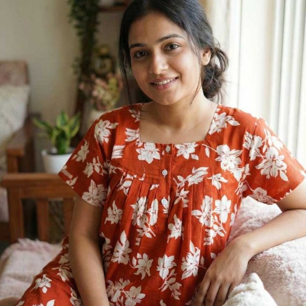 Front Open Cotton Nighty With Buttons, 55 Inches Long, Square Neck – Maroon