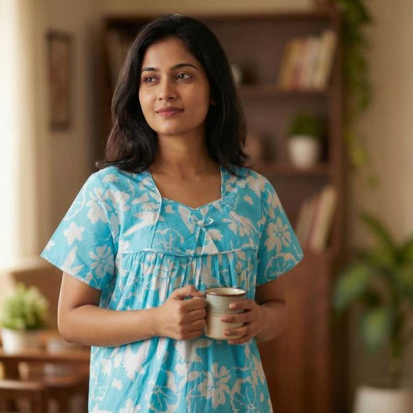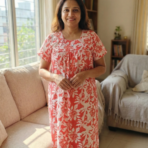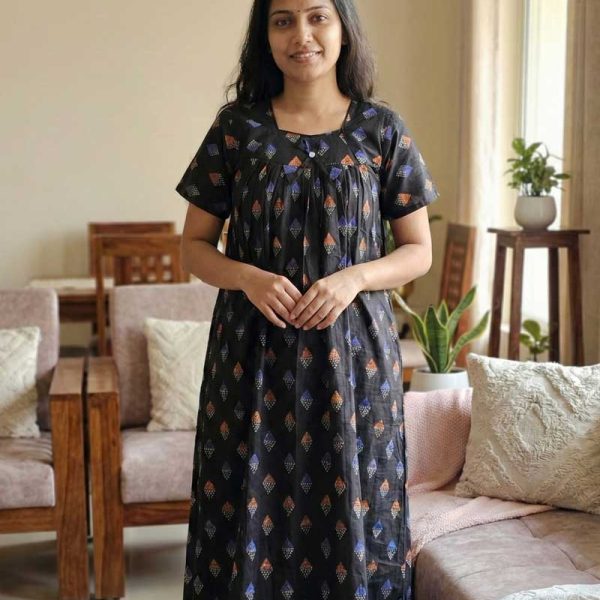 Front Open Cotton Nighty With Buttons, 55 Inches Long