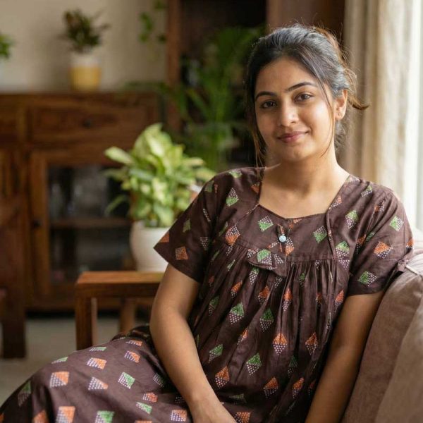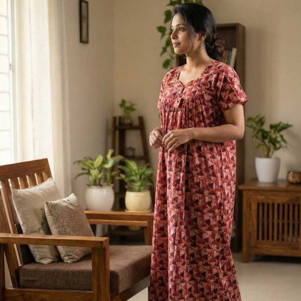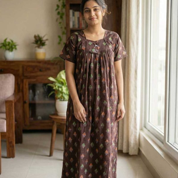 Front Open Cotton Nighty With Buttons, 55 Inches Long – Brown