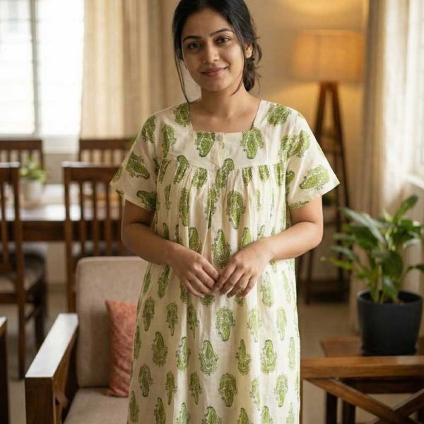 Front Open Cotton Nighty With Buttons, 55 Inches Long, Square Neck – Green + White