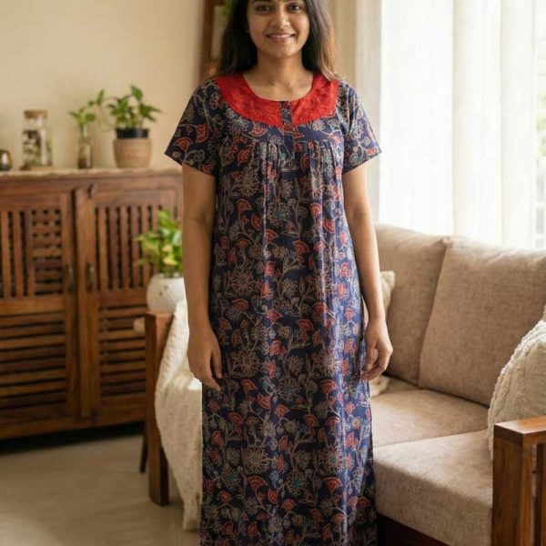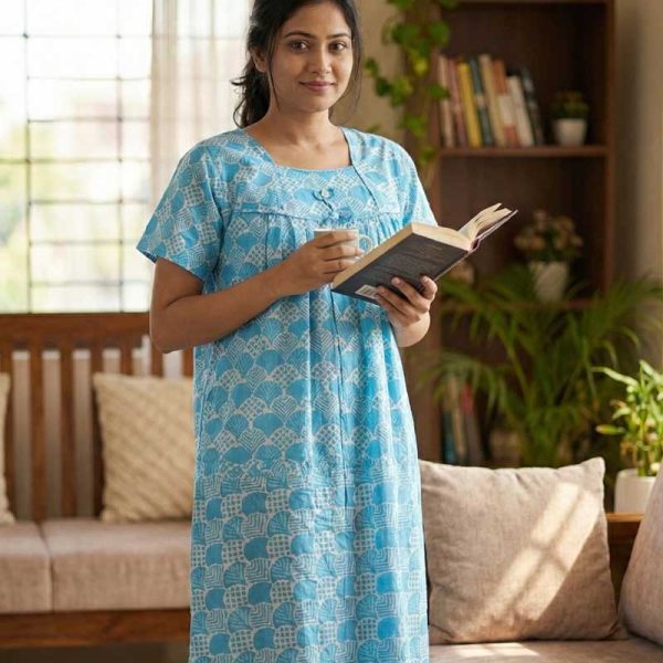 Traditional cotton nighty, Cambric cotton material, 55 Inches Length – Blue colour