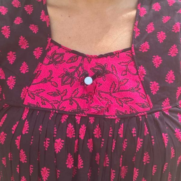 Traditional Cotton Nighty With Pleats, 55 Inches Long – Black + Magenta