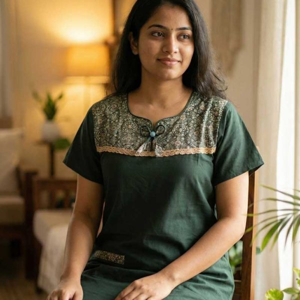 Comfortable Churidar Model Cotton Nighty, Ajrakh yoke – 55 Inches Long -Green Colour