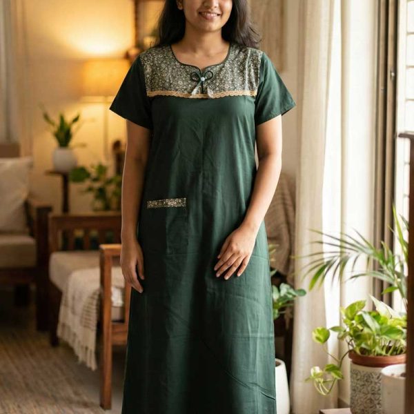 Comfortable Churidar Model Cotton Nighty, Hakoba yoke – 57 Inches Long – Green