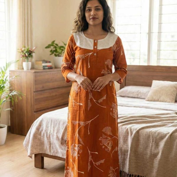 Comfortable Churidar Model Cotton Nighty, 55 Inches Long, Peter Pan Collar – Orange