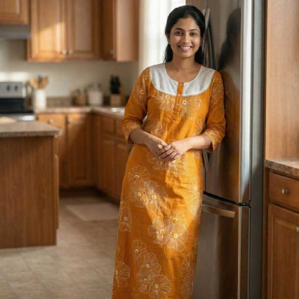 Comfortable Churidar Model Cotton Nighty, 55 Inches Long, 3/4th Sleeves – Yellow