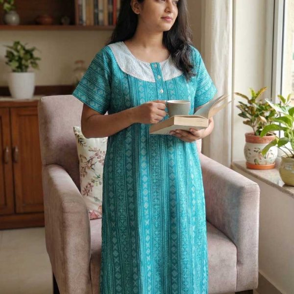 Comfortable Churidar Model Cotton Nighty, Hakoba yoke – 57 Inches Long – Blue