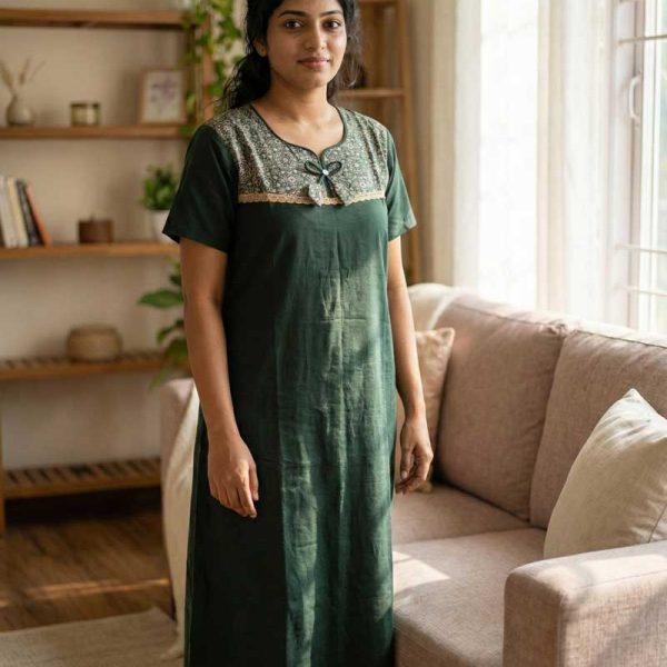 Comfortable Churidar Model Cotton Nighty, Hakoba yoke – 57 Inches Long – Green