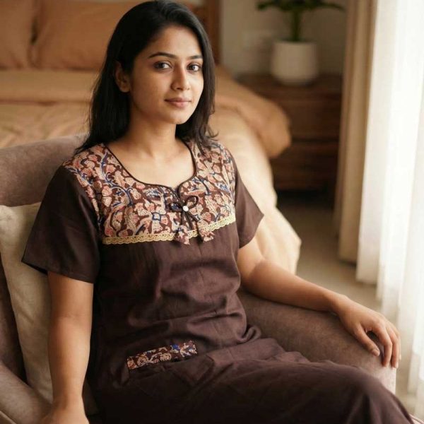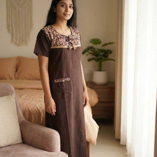Comfortable Churidar Model Cotton Nighty, Ajrakh yoke – 55 Inches Long – Coffee Brown Colour