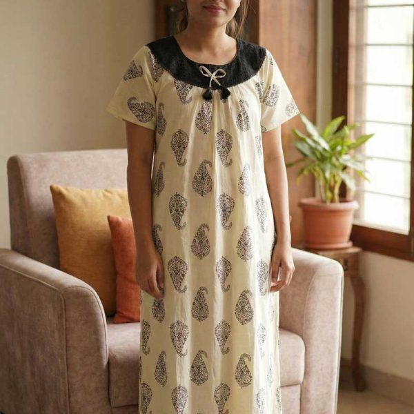 Comfortable Churidar Model Cotton Nighty, Hakoba yoke – 55 Inches Long – Cream Colour