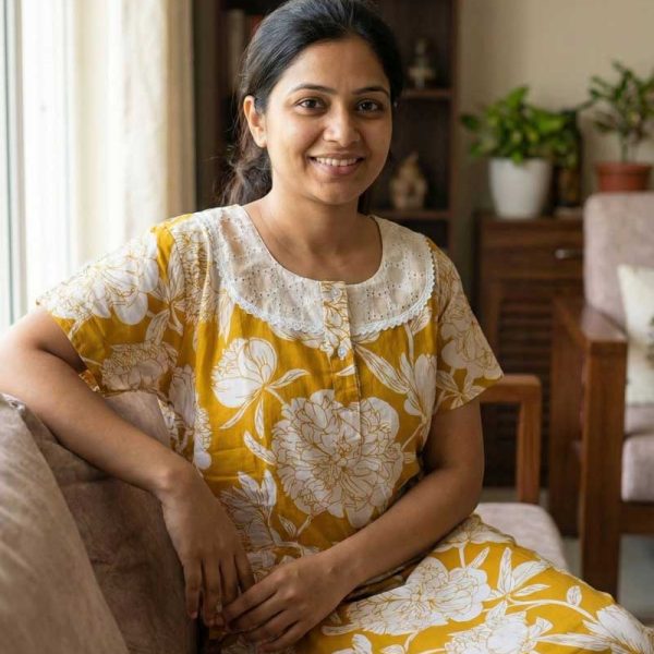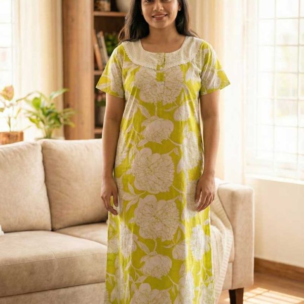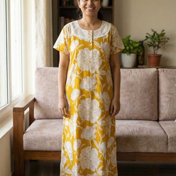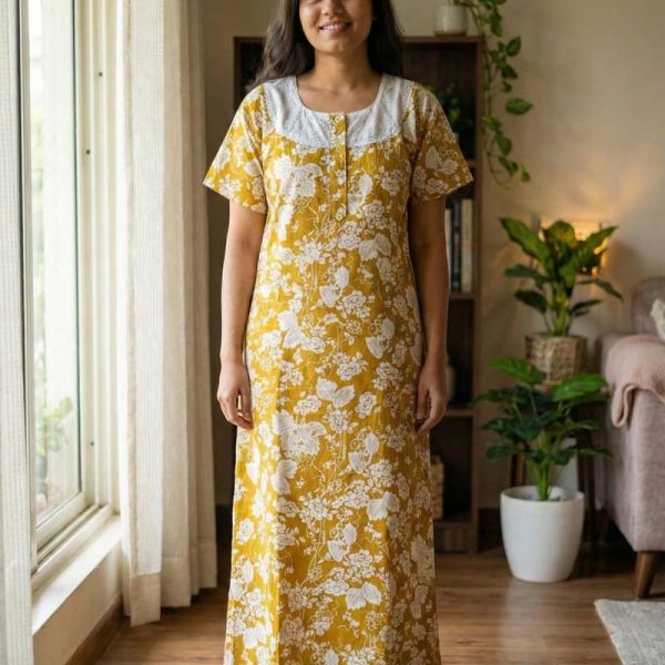 Comfortable Churidar Model Cotton Nighty, Hakoba yoke – 55 Inches Long – Yellow