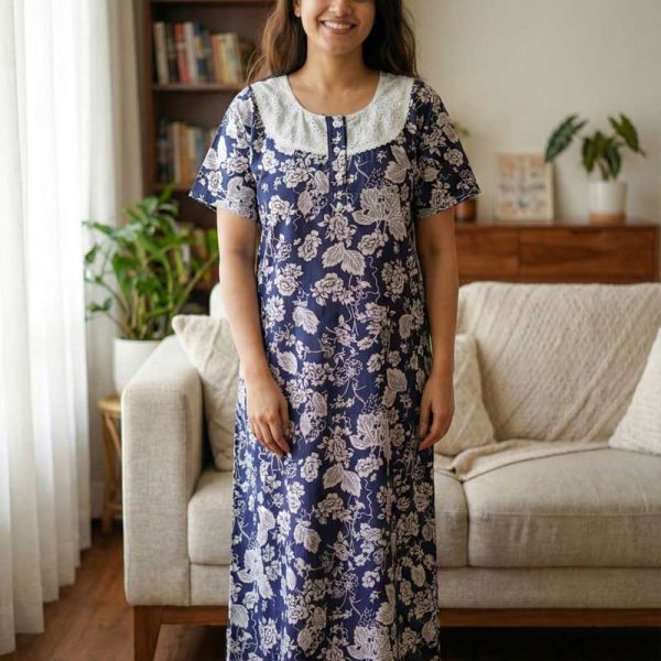 Comfortable Churidar Model Cotton Nighty, Hakoba yoke – 57 Inches Long – Blue