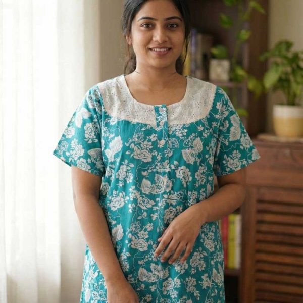 Comfortable Churidar Model Cotton Nighty, Ajrakh yoke – 55 Inches Long -Green Colour