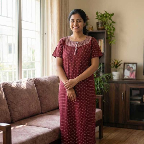 Comfortable Churidar Model Cotton Nighty with Buttons – 57 Inches Long – Maroon