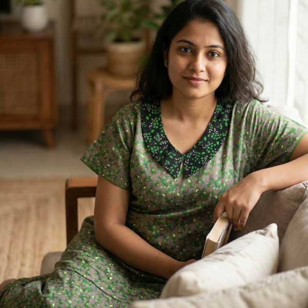 Comfortable Churidar Model Cotton Nighty with Peter-Pan Collar – 55 Inches Long – Black + Green