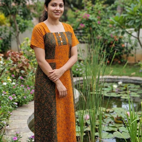 Comfortable Churidar Model Cotton Nighty with Buttons – 55 Inches Long – Black + Orange