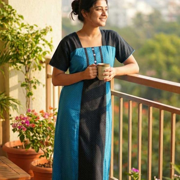 Comfortable Churidar Model Cotton Nighty with Buttons – 55 Inches Long – Black + Blue