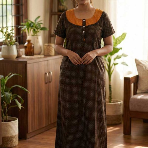 Comfortable Churidar Model Cotton Nighty with Buttons – 57 Inches Long – Coffee Brown + White Lines