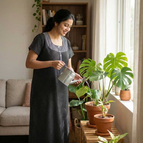 Comfortable Churidar Model Cotton Nighty with Peter-Pan Collar – 55 Inches Long – Black