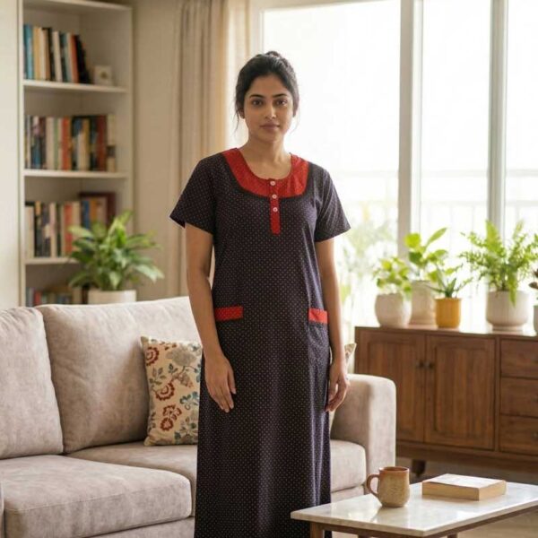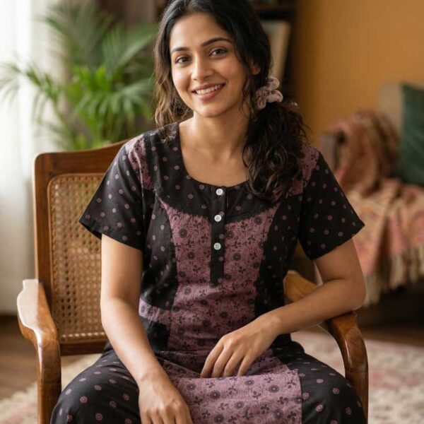 Original price was: ₹699.₹499Current price is: ₹499.Discover the perfect blend of traditional elegance and modern comfort with our collection of Churidar model nighties. Crafted from high-quality cotton, these nighties offer supreme comfort and breathability for a restful night’s sleep. With a wide variety of styles and designs available, you can find the perfect Churidar model nighty to suit your preferences. Browse our selection online and order now to experience the ultimate in nighttime luxury!