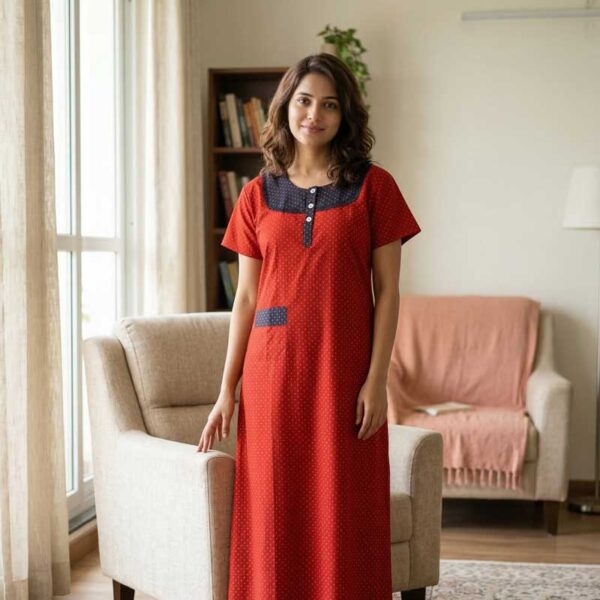 Comfortable Churidar Model Cotton Nighty, 55 Inches Long, 3/4th Sleeves, Hacoba Yoke – Red