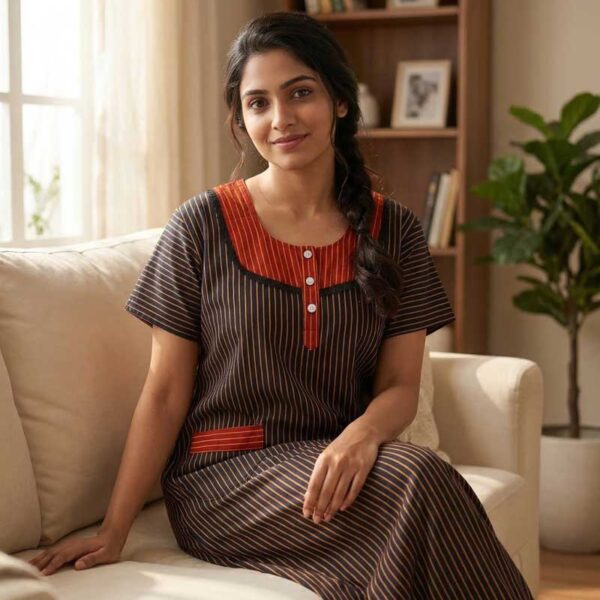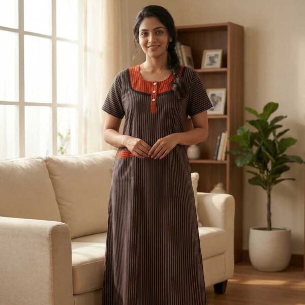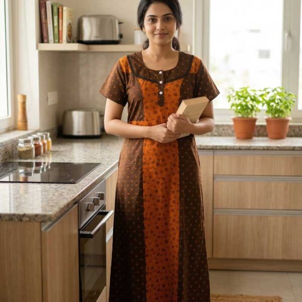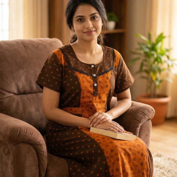 Comfortable Churidar Model Cotton Nighty, 55 Inches Long – Orange + Brown