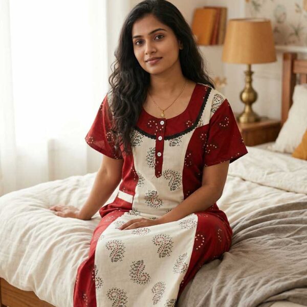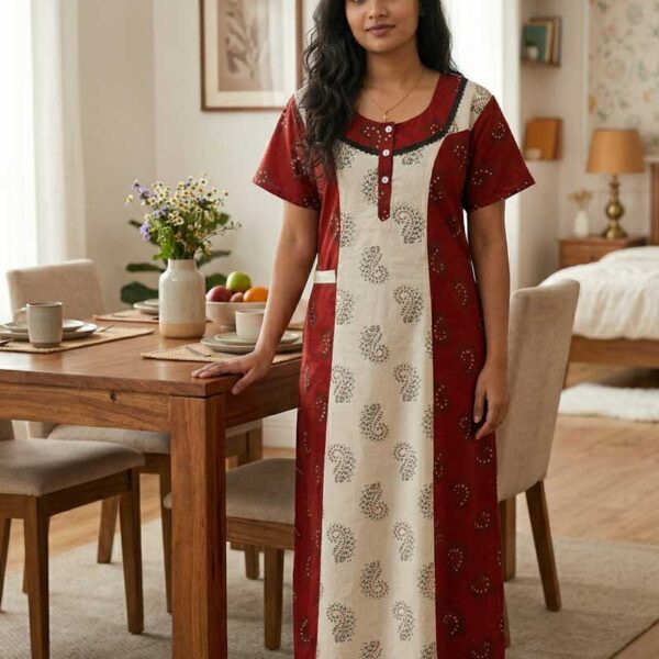 Comfortable Churidar Model Cotton Nighty, 55 Inches Long – Red + White