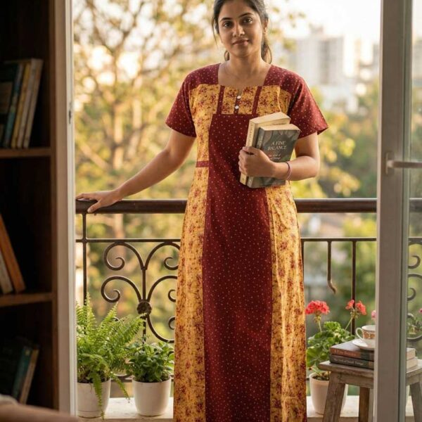 Comfortable Churidar Model Cotton Nighty, 55 Inches Long – Brown + Yellow