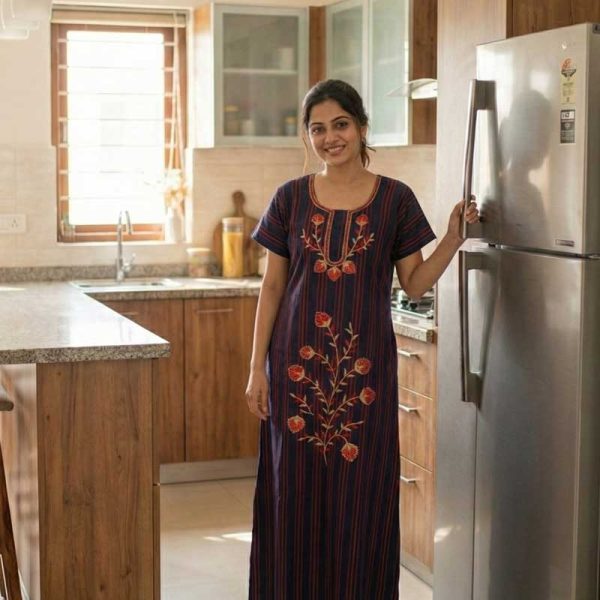 Comfortable Churidar Model Cotton Nighty -55 Inches Long – Dark Blue Embroidery